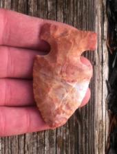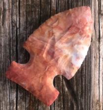 Raw unheated Flintridge from Neighbarger a couple Springs ago. Colors are Tan,Red,White,Pink and Gold. This is another type of point I found quite often around here. Chipped with antler tine and hammer stone. Base is ground. |