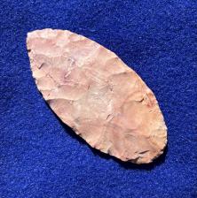 I made this blade from some old looking flintridge material that was difficult to work but it resulted in a very original looking blade that I made strictly by percussion. |