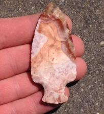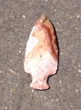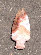 Pink,White,Red,Orange,Brown and Green Flintridge. Point is thin and colourful like most Flintridge Bottleneck points. Chipped with bone and antler and the base and notches are ground. |