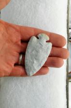 Creamy White Flintridge with a Sky Blue milky quartz vein running from one edge to the notch on the other side going all the way through the blade. I copied the base from a Dove I found a few years ago by Duncan Run creek. Chipped with stone and bone base is ground.