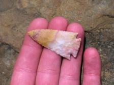 Raw Nieghberger Flintridge in Tan,White,Pink,Cream,Red with a few small quartz inclusions. Chipped with antler and bone. Base is lightly ground. |