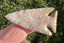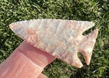 This corner notch point is made from some colorful flintridge material. Good symmetry with nice notch work. |