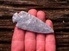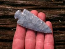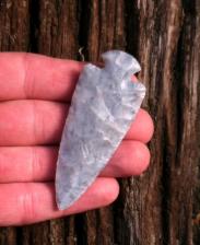 Beautiful replica of an Ohio Button Dove made from raw(uncooked) Flintridge I dug a few years ago. Beautiful Blue and Lt. Blue with darker mineral streaks. Billeted with Whitetail antler edges done with antler tine and notched with Buffalo rib bone blade is beveled and base is ground.