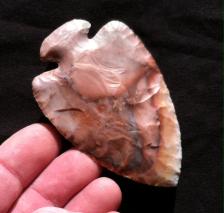 This beautiful piece of Flintridge has Blues,Pinks,Red,Brown,Purple and Cream. Blade has nice thickness flat on one side and nice convex on the other. Percussioned with a hammer stone edge work done with antler tine and notched with Buffalo rib bone. Looks and feels old I really like this point. |