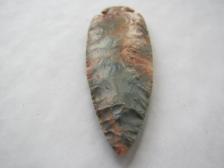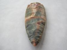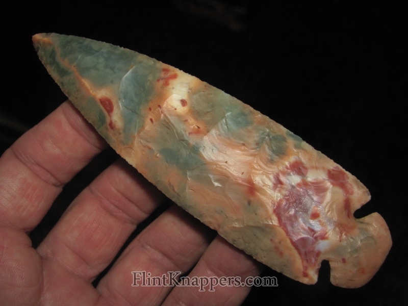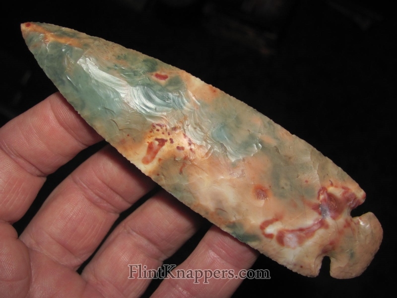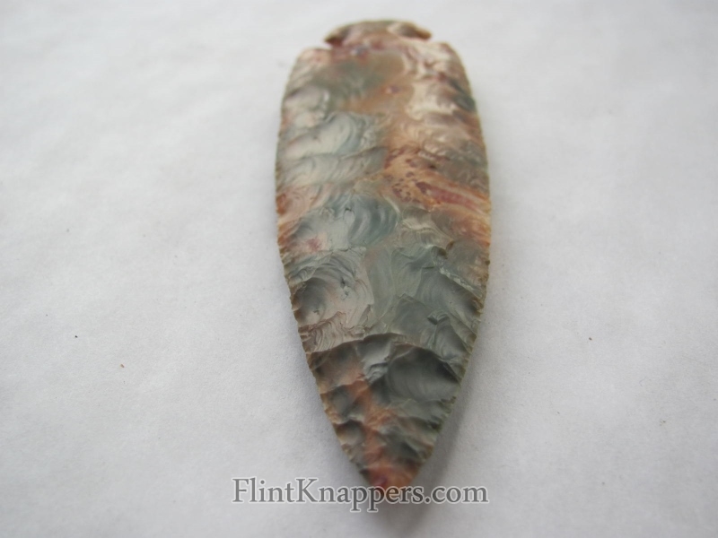 A stunning piece of craft in one of North America's most spectacular toolstones. This modern Dovetail is knapped from genuine Flintridge flint, showcasing that unmistakable swirling palette of teal, cream, and iron-red that makes Ohio's premier flint so sought after by knappers and collectors alike.