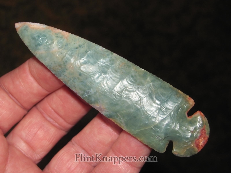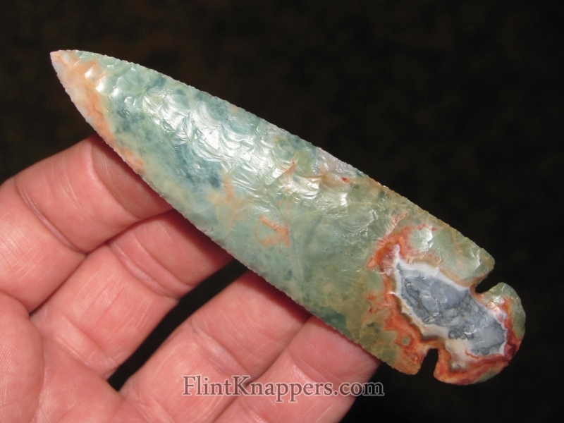 Flintridge this colorful and this translucent doesn't come cheap or easy, and a knapper of Phil's caliber doesn't waste it. This is display-case work — the kind of piece that draws eyes and holds them.