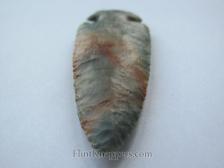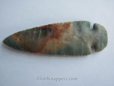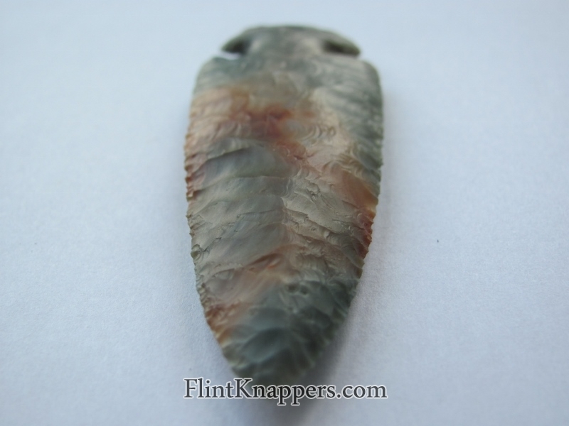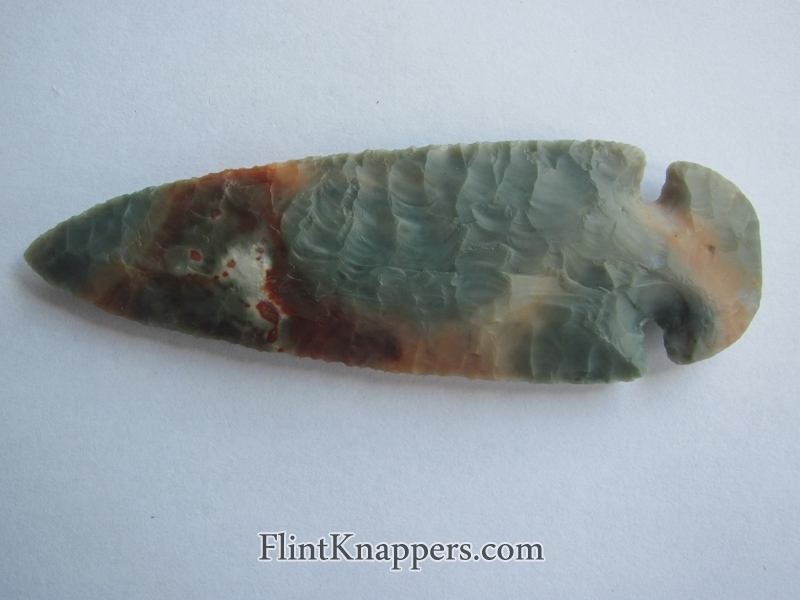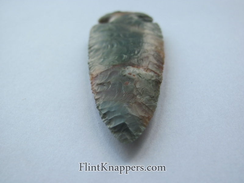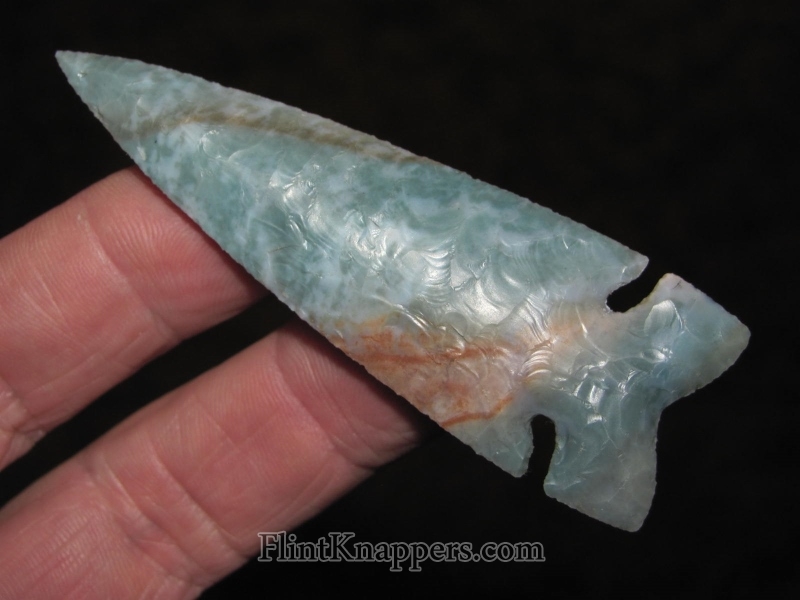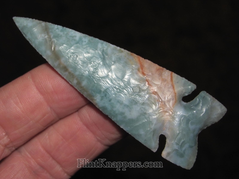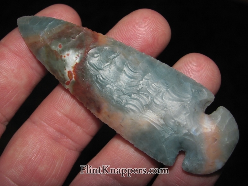 Phil Love delivers again with this stunning Dovetail knapped from Ohio Flintridge. The stone displays that signature Flintridge palette: cool aqua-green and blue-gray swirling through creamy white, punctuated by vivid iron-oxide rust staining that gives this piece a wild, painterly energy. No two Flintridge pieces ever look alike, and this one is exceptional.
