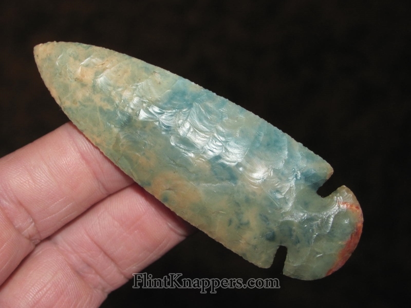 The material is the star here. This is rich aqua-green Flintridge chalcedony — the kind of translucent, gemstone-quality flint that made Ohio's Flint Ridge one of the most prized lithic sources in prehistoric North America. Swirls of cream and warm peach cortex marble through the dominant blue-green body, accented by traces of iron-oxide red at the base. The stone has a waxy, almost glassy luster that catches light beautifully from every angle.