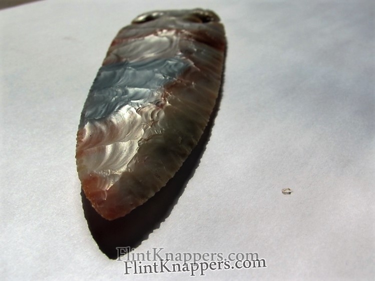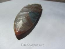 This is a gorgeous E-Notch in classic Ohio Flintridge flint, and the stone absolutely steals the show. Sweeping bands of burnt orange, caramel, and creamy white flow across the blade, meeting a striking pool of blue-gray chert near the tip — the kind of color variation that makes Flintridge one of the most sought-after knapping materials in North America.
