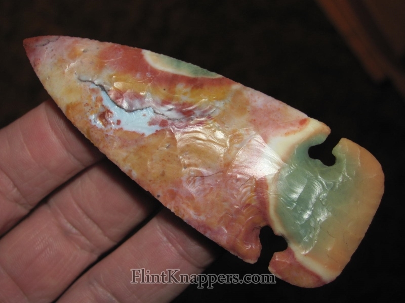 At 3 9/16 inches this is a substantial point with real visual presence. The combination of Phil Love's craftsmanship and this extraordinary multi-colored Flintridge rough puts it firmly in display-case territory. |
