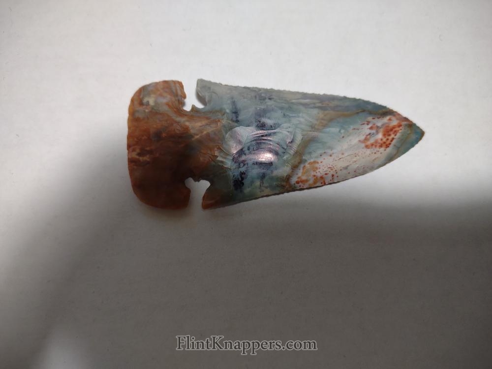 The form is a classic E-Notch — one of the more visually striking notch styles in the Early Archaic toolkit. Phil has executed the deep, rounded notches cleanly and symmetrically, producing those characteristic squared basal ears that frame the aqua base like a setting around a gemstone. The blade is broad and well-shouldered, tapering confidently to a sharp tip. Flaking across both faces is bold and controlled, with long percussion scars on the body giving way to refined pressure work along the edges.