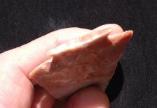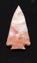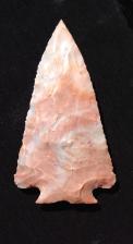 Beautiful Pinks and Red Flintridge Chalcedony with a few small quartz inclusions. This blade is the same material most Ohio Decaturs were made from and this would be considered a large one. Chipped with antler billet and pressured with antler tine notched with antler tine and fractured the base with antler tine. Blade is beveled and lightly serrated base is fractured and ground.