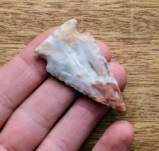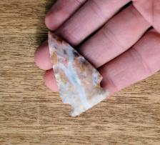 Raw unheated Flintridge White,Orange,Red,Pink,Purple and Beige. Chipped with antler tine this point also has a milky quartz inclusion all the way through the point. Base is not ground. |