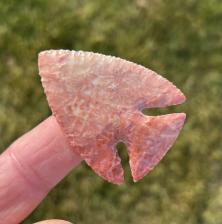 This snyders style point is beautifully made from some unusual reddish flintridge material that has a quartz pocket near the base. |