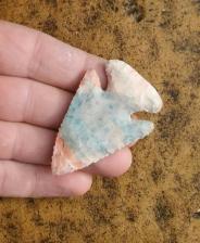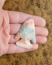 Beautiful gem Flintridge Green,Blue Green,Pinks,Red,Orange and Cream. I chipped this at the Deer and Turkey Expo in Columbus this year. The blade is beveled slightly serrated and the base is ground. |