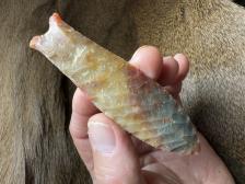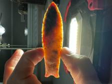 Made from beautiful semi translucent Coastal Plains chert from Brier Creek. Rare green color with deep crimson red! Serrated sharp, hafting area is ground. Thanks for looking! |