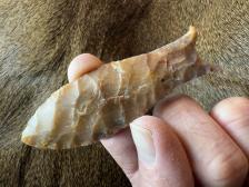 Made from beautiful semi translucent Brier Creek chert. Pictures 2&3 show tiny holes which are hard to knap around. They are called vugs, small voids lined with tiny crystals. Serrated sharp, hafting area is ground, thanks for looking! |