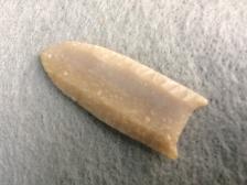A nice, small Folsom knapped by talented Texas flint knapper, Jerry Bridwell. It is made from light tan Colorado River cobble from Texas. Nice flaking and flutes. Jerry had only been knapping three years at the time. Knapped Mar, 2000. Inv # 0003-135R. Signed with diamond scribe: JB |