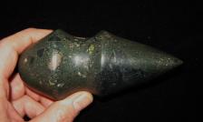 Full grooved stone axe made out of Gowganda tillite, a 2 billion year old conglomerate from northern Ontario, Canada. This material (usually with smaller inclusions) was used prehistorically in this area for ground stone tools. |