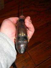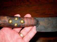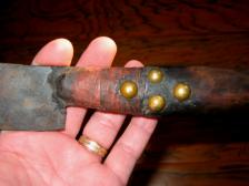 Here's another fur trade era knife. This one was made to look old as well. It has a hand forged 8 inch blade hafted to a cherry handle with gut. The aged brass tacks adorn the haft area and the butt area of the knife. The brass tacks are purposely stressed and uneven in places to duplicate the period work. The butt of the knife has a bear effigy in the Iroquois style. These knives are generally snapped up by customers before ever being generally offered so get it while it's just listed. |