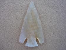 A nice Jim Hopper gem point. Superb parallel flaking, that he is known for. This gem point is made of translucent Montana Agate with a tinge of yellow. Knapped Dec, 1998. Signed JH 98. |