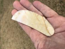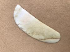 A beautiful Gerzean blade, knapped by the pioneer of the stone-on-stone knives, Dale Cannon. The Gerzean blade was an ancient Egyptian blade type that was flaked on only one side. The material is Oregon Indian Paint. The colors are cream and light tan, with a spot of light orange. Dale worked with the Smithsonian to help design the flint knapping exhibit. I’m sure Dale would have put this blade in one of his beautiful, engraved marble handles, if he’d had enough time before the knap-in. We purchased some of his knives and the blade from him at the Water Creek Knap-in, May 2000. Inv # 0005-207R |