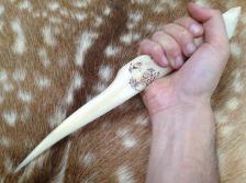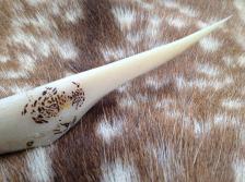 This Dagger is made from a Giraffe Ulna bone, and is one solid piece. keeping the natural shape and curve of the bone, the edge is actually on the inside of the curve (facing up in this photo), and the grip was simply shaped to fit comfortable in the hand, with finger grooves. Since it reminded me of a large fang, I decided to burn onto it something that has large teeth. And so the name "Leopard's Tooth".
