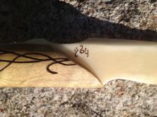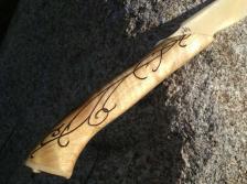 Blade is giraffe canon bone. Grip scales are figured Myrtlewood (seriously, that's a type of tree. Even sounds elven!).