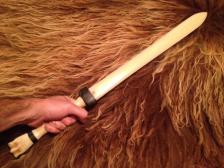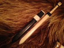 The sword is hand carved from a Giraffe canon bone (lower leg). The handle scales are Zebra canon bone, as is the pommel.