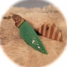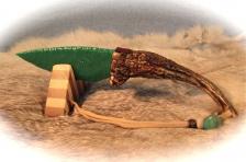 A “Wade Anthony Custom” with an antique Carrara glass blade in a “John Deere” green. The blade is nicely knapped & matched to the handle. The handle is a “gnarly” and unusual formation of Whitetail deer antler that I have had set back from a long while – waiting for the right project. It really pairs-up nice with this sharp blade & feels great in the hand. A soft leather lanyard & beads rounds it out. All is flamed, buffed, & polished to near perfection! I created a stand out of layered hardwoods….this combo is COOL! The knife is 8 ¼” long. I will need an additional $7.00 for the shipping & insurance. **NOTICE: WHILE SHARP & BUILT TO LAST….MY CREATIONS ARE FOR COLLECTING PURPOSES & NOT FOR HARD USE! |