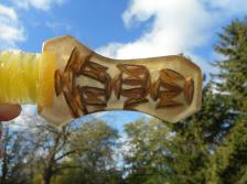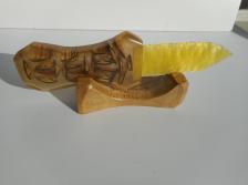 Dagger type piece is about 8 3/8 inches long. Gold Fiber Optic Blade is about 3 3/4 inches long, is very nicely shaped, flaked and sharpened. Handle is of a 2 part Clear Cast Resin tinted slightly gold. Pattern inside is of a group of nut shells with dark edges which really make this piece unique. Handle is about 4 1/2 inches long. Fits very comfortable in the hand. Unique gift for a collector or yourself. The cradle type base is of a neat piece of Spalted Maple which accents the blade and handle.