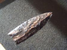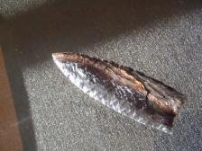 This piece was made using percussion and pressure flaking, from eastern Oregon gold sheen obsidian. Layers of clear, black and red are infused with gold iridescence. The channel flakes, made by pressure, run about a quarter the length of the blade. |