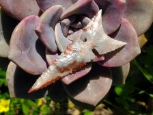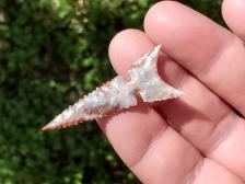 Goldfield Jasper has many names, which includes Gemfield Chalcedony, RoosterTail Jasper, and Bullseye Jasper. No matter the name you call it, it is surely a beautiful stone! The pale blue gray, pale peach and dark red swirled color patterns really add to this finely flaked point. Especially notice how deep the notches are. Any closer and they would cut off the base.