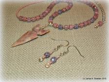The color in these high quality Czechoslovakian glass beads are an exact match to the pastel colors in the arrowhead flintknapped and signed by James K. Bowden.  The 1 & 13/16 in. by 7/8 in. arrowhead was chipped from a glossy Goldfield Jasper from Nevada, and was intentionally dulled on the edges for comfort while being worn.  The necklace length varies from 18 & 1/2 in. to 21 in. due to the adjustable dangling chain that the clasp hooks into.  The wire wrap and clasp are sterling silver, while the bail, chain, and earring hooks are silver plated.