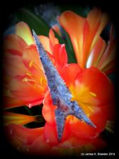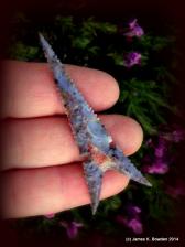 This blueish lavender arrowhead has a rare and unique color that you do not see very often.  It's beauty is further enhanced by the glossiness of the stone and intricate flaking.  The tip and ears on it are very narrow and drawn out, making it a very collectible piece.