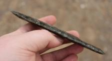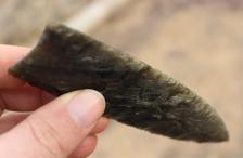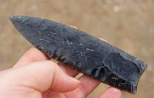 A very fine and large western style clovis with nice flutes on both sides, and they were done by hand no jigs only direct percussion. If you turn this piece at an angle it shimmers with gold. Large piece measuring 5 7/8 inches long. Don't miss this fine framer or skinning knife. Skin a buck like one of the clovis people!!! Shipping is $6 priority with tracking and insurance. I prefer paypal but also accept money orders, checks, and cash. |