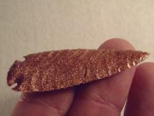 This sparkly point was pressure-flaked from a slab of the man-made material, goldstone. It is 3/16" thick and nicely tapered to the thinner tip. |
