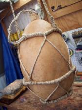 for those long treks through the hot brush. natural gourd, hand twisted hemp cordage, and rough cut cork. approximately a 2 quart capacity. the gourd has been leached with boiling water and scraped inside, but some small amounts of organic and unharmful material dislodging should be expected. this can be eliminated by coating with brewers pitch. |