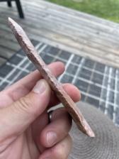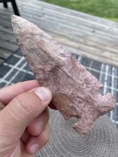 Beautifully colored / patterned Graham Cave blade. This one is big - 5 1/4” x 1 7/8”. Heat treated Burlington chert. |