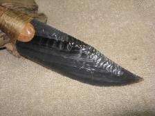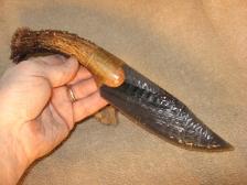 This beautiful and very nice knife is 11 inches long and this very beautiful blade has been knapped out of a Gray Banded Sheen Obsidian. Tipped in a strong light, there are subtle rainbows. Just could not capture them in the pics. This handle is a just perfect black tail deer antler. This piece would certainly stand out in any knife or flint knapping collection. The blade has been hafted to the antler handle with resins and artificial sinews and a paw print is painted on the butt of the handle. Remember that shipping is included in this price.