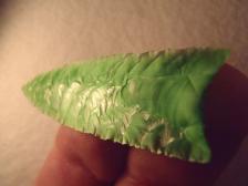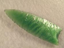 Even if green wasn't my favorite color, this would still be one of my favorite points. It was pressure-flaked from a slab of green fiber-optics, and is pressure-fluted on both sides. |