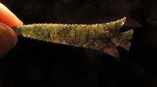 This is a Columbia style point made of central OR clear agate with green moss in it. Its pretty, but was an absolute rascal to flake, and behaved more like cranky basalt with stubborn crystal pockets so the flake pattern isn't what I'd like it to be but the color of the material kind of makes up for it. The back lit photo shows it better than the first photo. I think I'll take a break from fighting with tough moss agates for a while. |