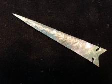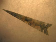 This very nice Wintu point is made from a nice piece of green moss agate. I had some other green moss but it was cranky and didn't flake well whereas this piece worked nicely. Expanding notches and a well made Wintu style base. I've seen originals that actually where this size and shape. The shape and material make this one an exceptional piece |