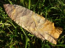A colorful Greenbriar knapped by the master flint knapper, Tim Dillard. It is made from heat treated Eastern Missouri Burlington. The colors are purple, gray, and tan. Knapped May, 2004. Signed. |