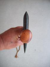 blue/green granite head pressure fitted into a cherrywood handle with deer skin lace grip and wrist thong.