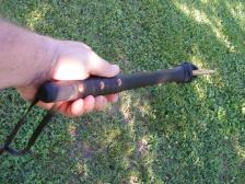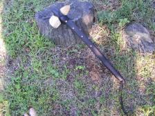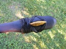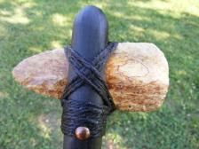 Here is a new piece just recently finished,,, this War club was made from a piece of Oak I picked up on the mountain that had come off a tree from being struck by lightening.......... The club measures 19 1/2" long and was aged for an old look, it has a leather wrapped handle and decorated with brass tacks,,, The percussion flaked Celt is Keokuk and was socketed into the oak club and lashed with fiber cordage.......... This club while a sturdy weapon isn't for use and decoration only....... Shipping included in the price. |