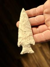 awesome Hardin blade knapped to replicate usage with a stout bevel. made from keokuk, I notched the blade before finishing the thinning process giving it a thicker cross section between the ears compared to the blade. |