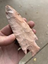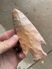 A Midwest style Hardin blade. A nice orange and blue veined piece of Burlington. Point also has a neat crystal pocket/inclusion near the tip.