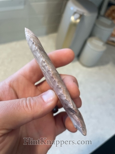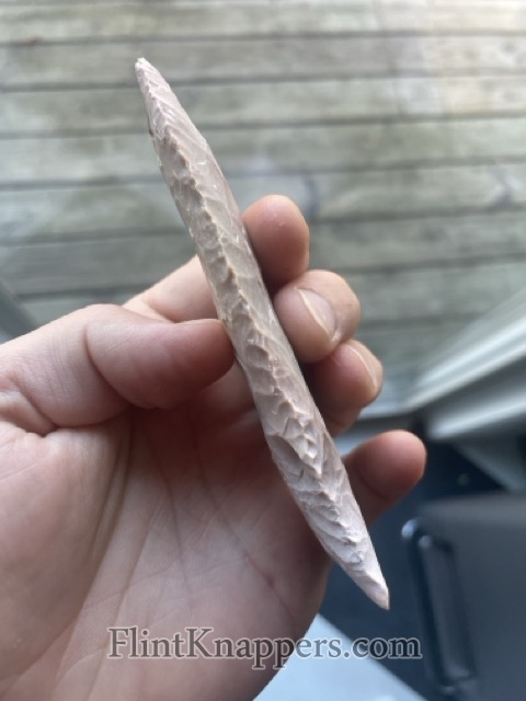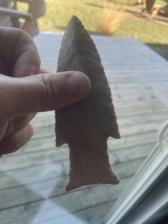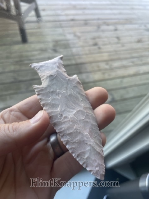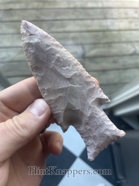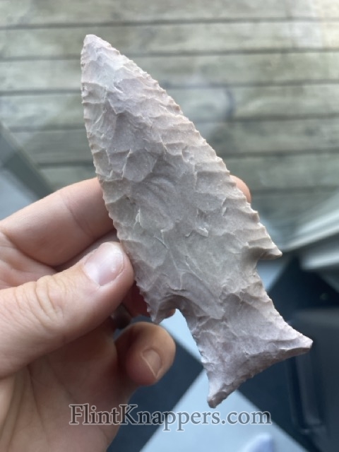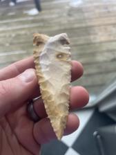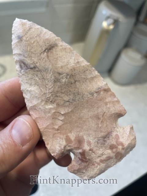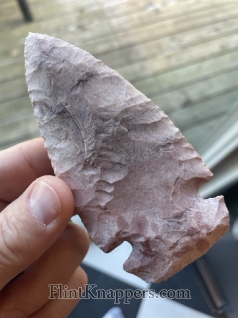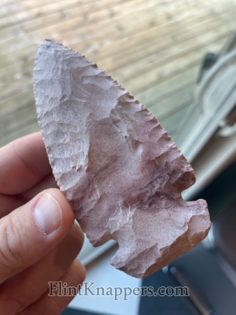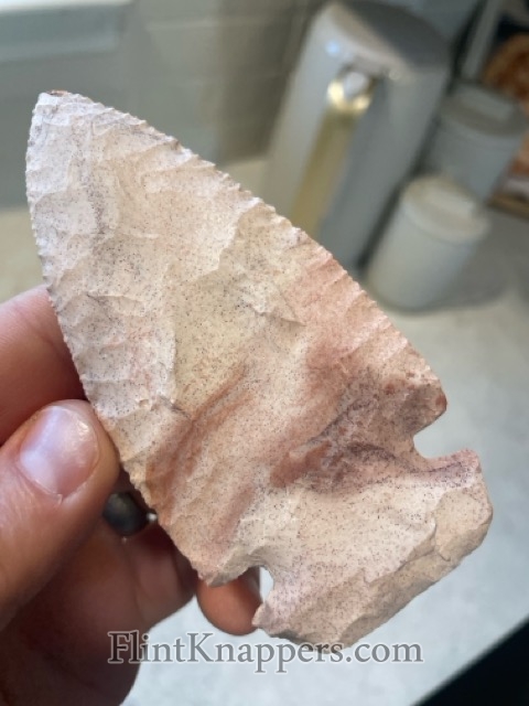 A heat-treated Burlington Hardin arrowhead. Some very fine flaking along the blade edges. This variety of Burlington chert is very colorful and has a nice waxy appearance and feel to the rock. Color transitions to a lighter shade of cream towards the base. Point also has micro-serrations.