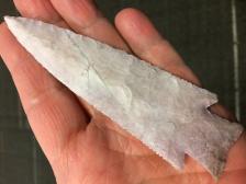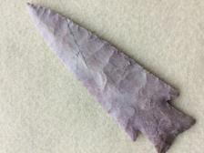 A very nice, needle-tip Hardin, knapped by one of the best commercial flint knappers in the U.S., Jeff Gower. The workmanship is exceptional. The Hardin is knapped from Burlington and is light purple. Knapped Oct, 1997 |